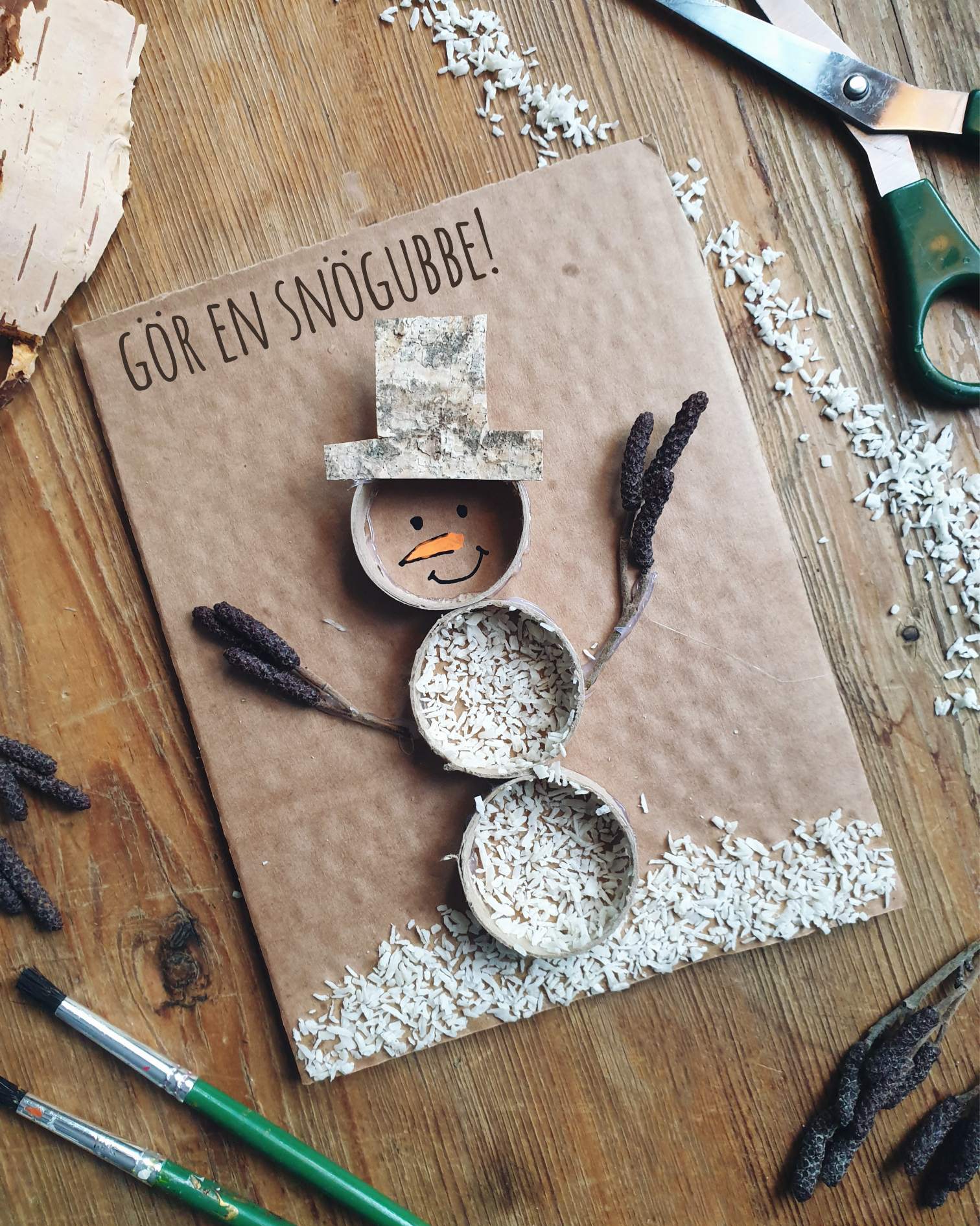 En enkel och supermysig vinteraktivitet: bygg en snögubbe på en kartongbit! Vi klipper tre ringar av en toarulle, limmar fast dem som snögubbens delar och fyller med lim och kokosflingor som "snö". En bit björkbark blir hatt, måla morotsnäsa, små pinnar som armar.