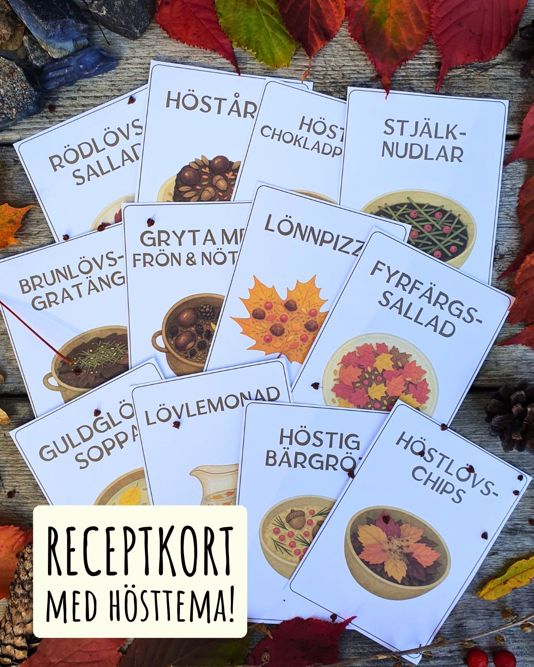 Tolv fantasifulla receptkort till uteköket med hösttema! Perfekta att ta med till sandlådan, skogen eller trädgården. På framsidan finns rätten illustrerad och på baksidan hittar ni enkla "ingredienser" från naturen. Läs mer om materialet HÄR!