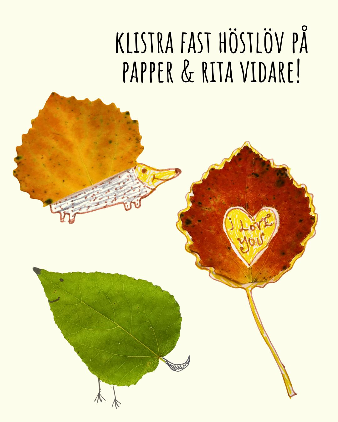 Använd fantasin! Vad ser lövet ut som? En fågelkropp, ekorrens svans, en klänning eller kanske en hatt? Pressa löven i en bok och limma sedan fast de på lite tjockare papper, rita ben/ansikte/kropp osv med kritor eller tuschpennor. Kreativt och fantasifullt höstpyssel som passar både barn och vuxna!