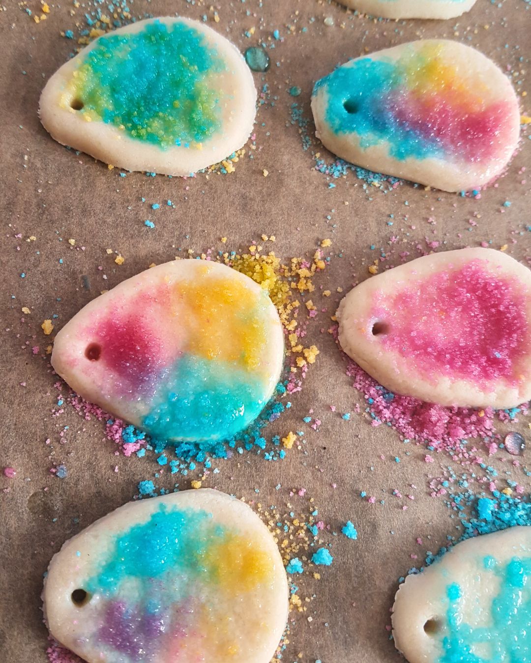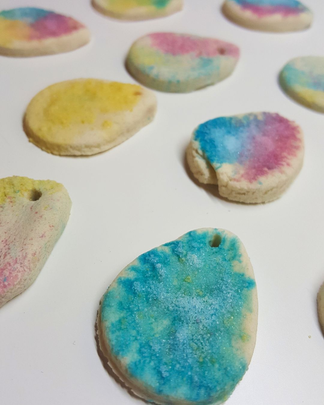 Resultatet varierar, vissa blir väldigt fina och jämna i färgerna, andra inte lika mycket. Och det är det som gör hela processen lite spännande. Har kan man testa sig fram och komma på det "bästa" sättet att skapa olika färgskiftningar och mönster på äggen. Det kan även fungera fint att kavla in färgat salt i degen och sedan skära ut äggformer. Resultatet blir då en något mer prickig och dovare färg, också fint!