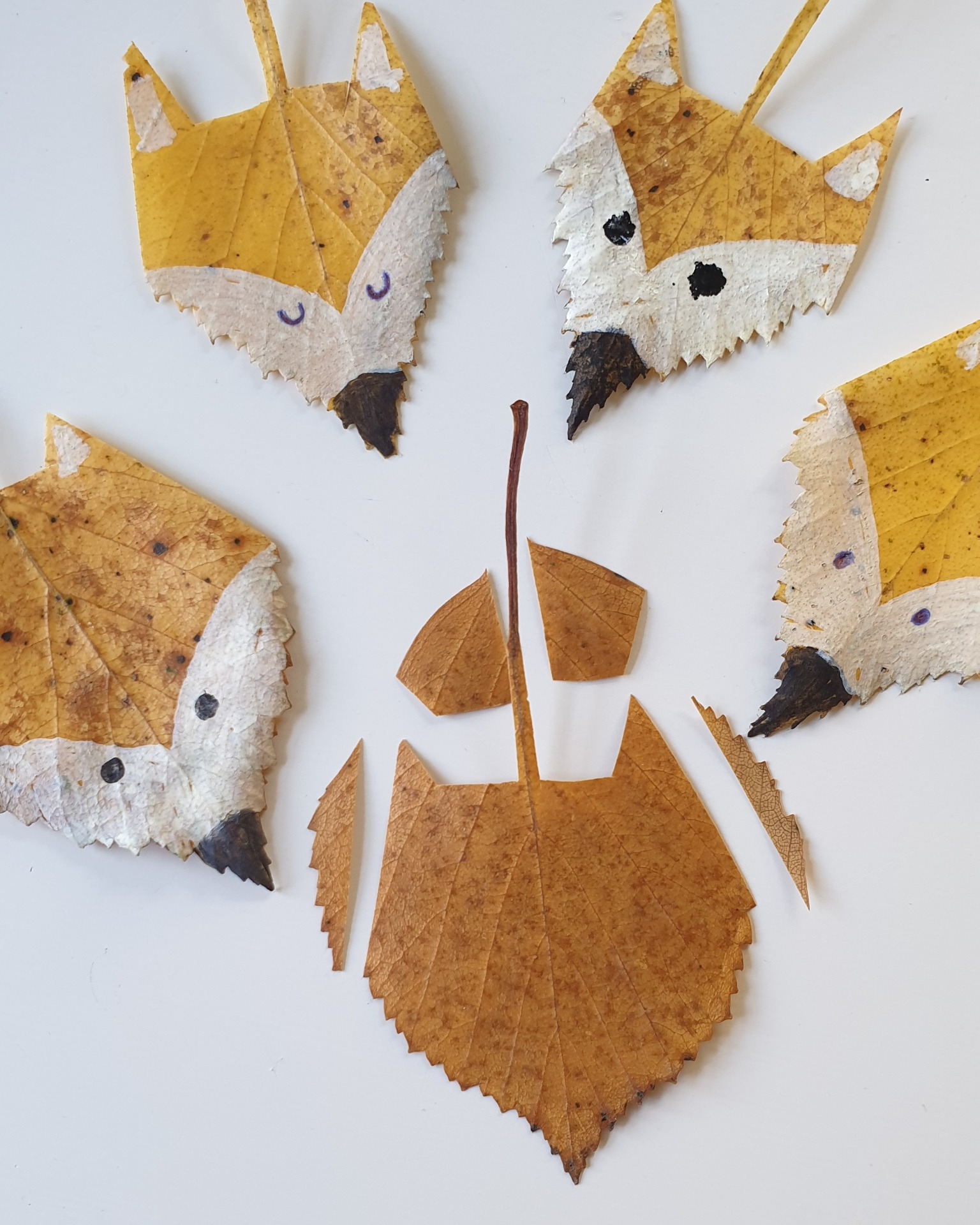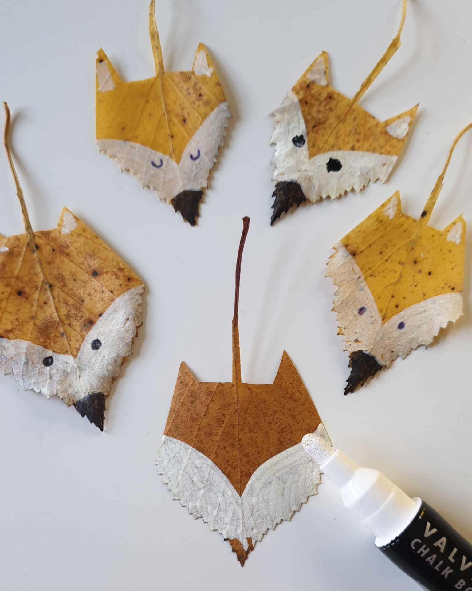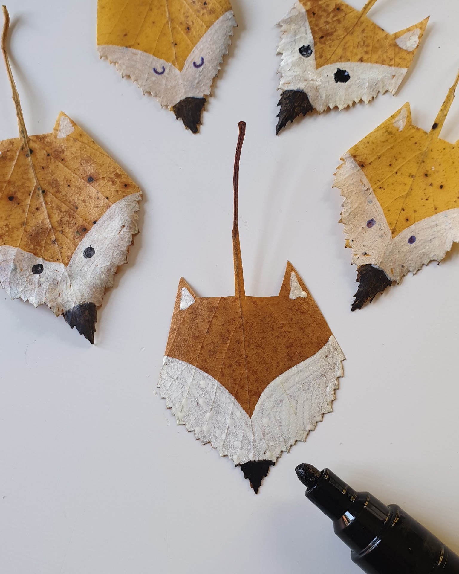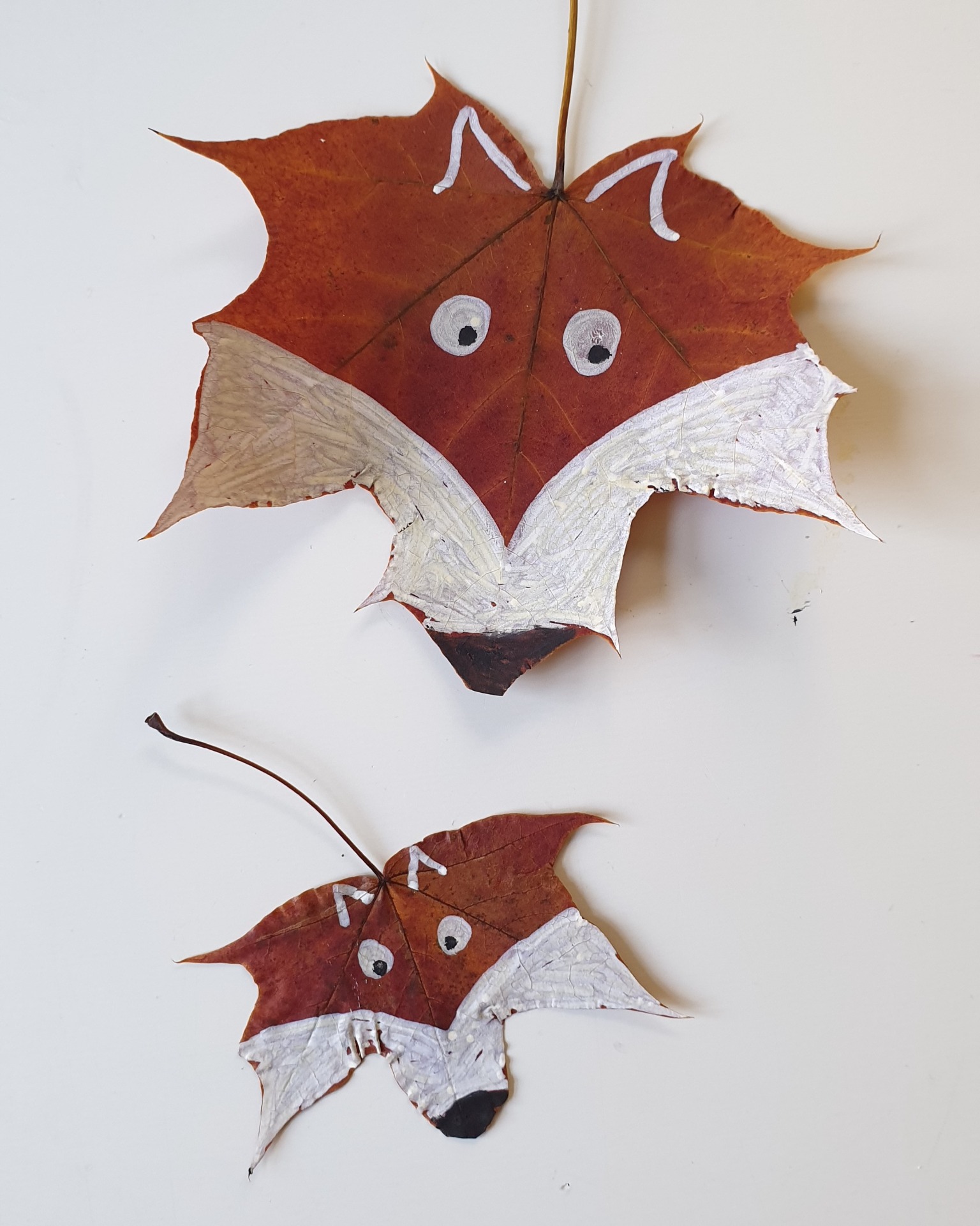 Naturen om hösten bjuder på världens finaste pysselmaterial! Med några torra löv, en vit och en svart penna förvandlar du lätt lönn och björk till söta små rävar att hänga i fönstret eller på väggen.