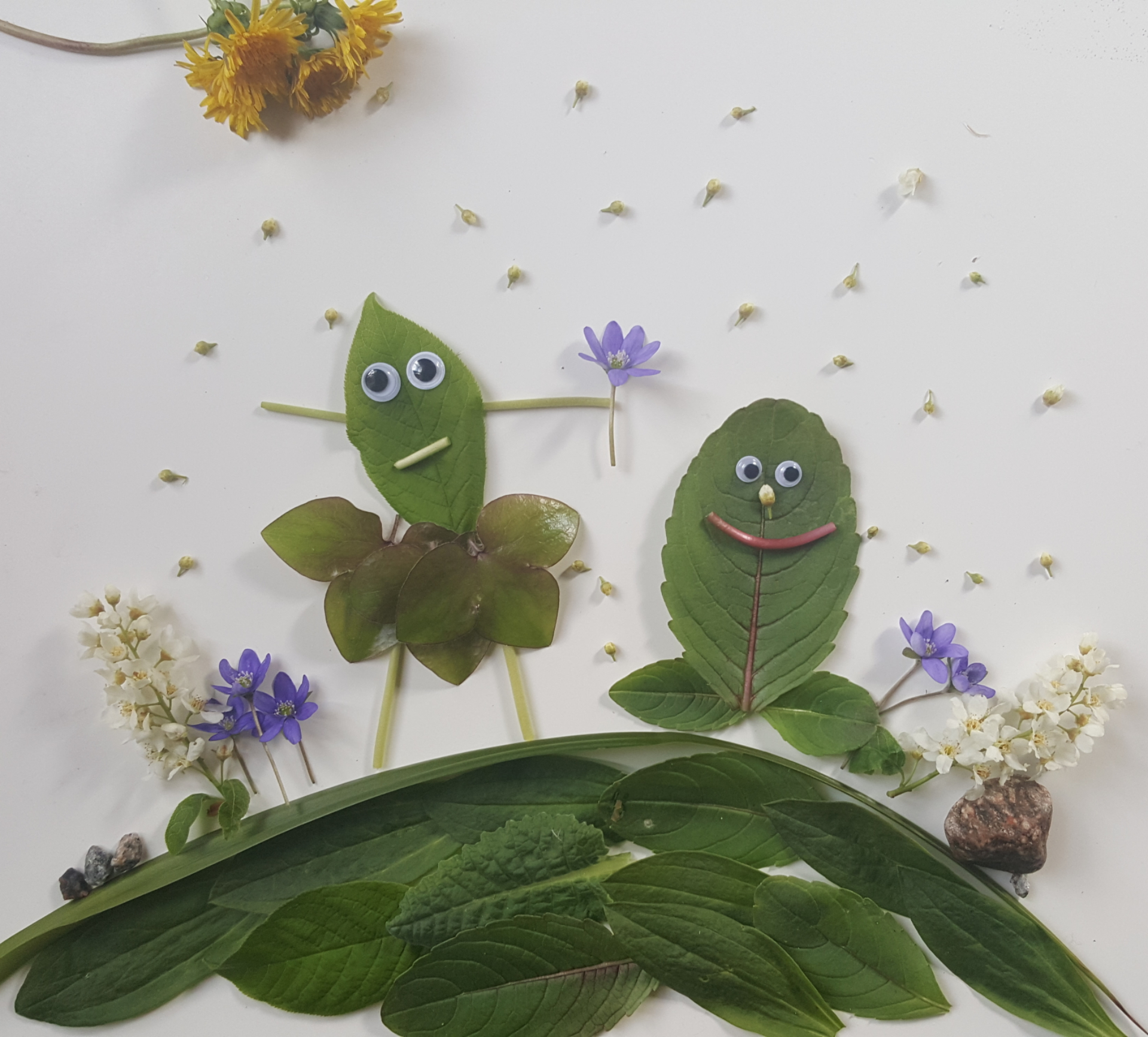 Ett större blad kan bli kropp eller ansikte. Mindre blad kan bli armar, ben, öron eller hår. Blommor och kronblad kan användas som händer, fötter eller små detaljer. Om ni vill kan ni sätta dit rörliga ögon för att ge figurerna mer uttryck.