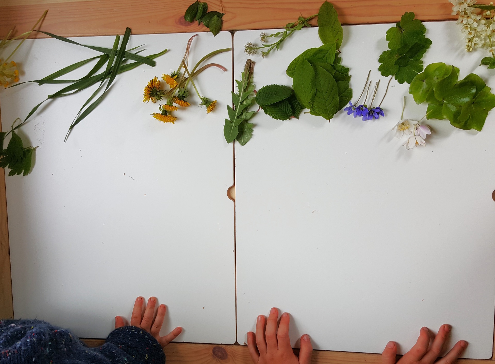 Börja med att samla material ute. Försök hitta blad som ser olika ut. Några stora, några små, några smala och några rundare. Plocka gärna också några blommor eller kronblad.