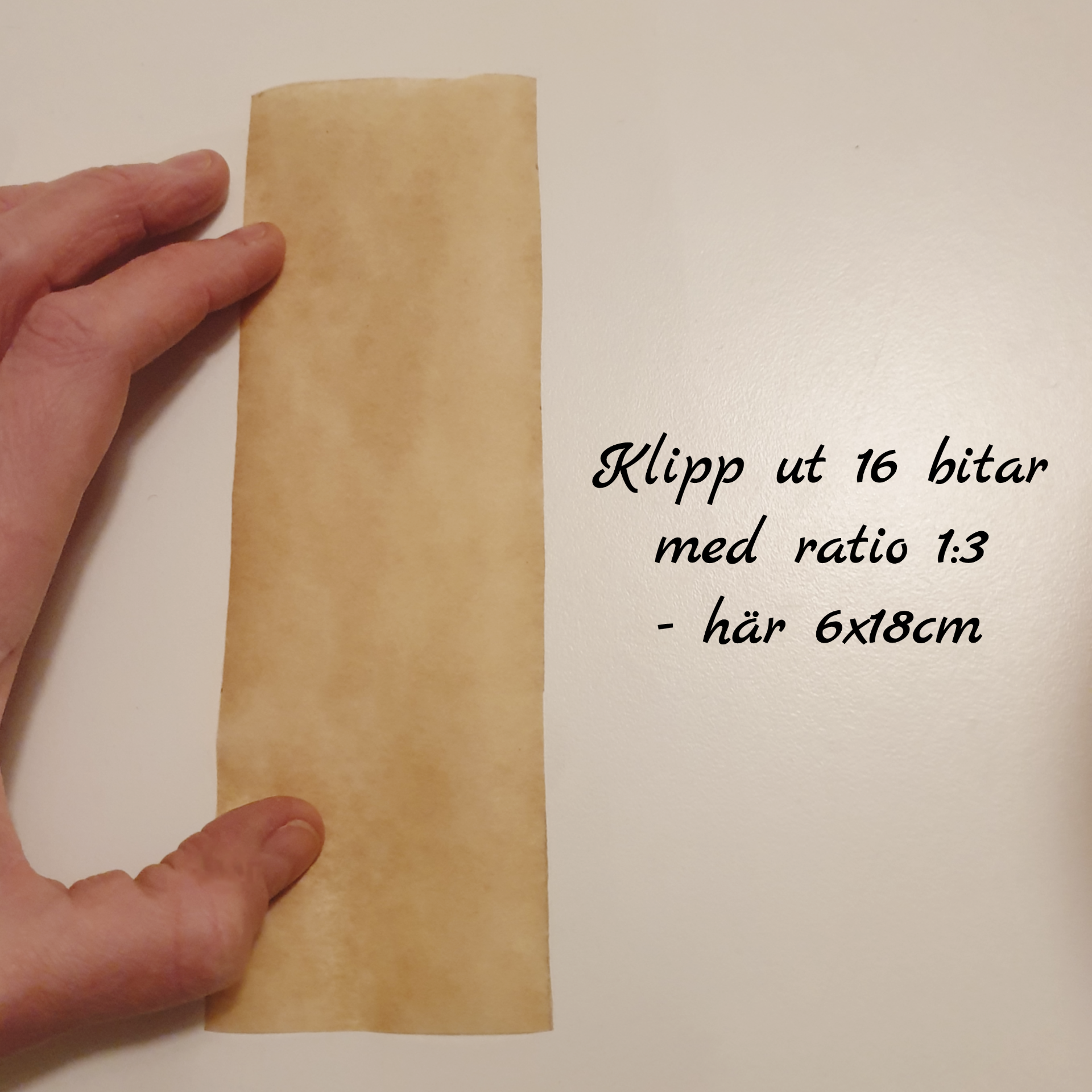 1. Klipp ut 16 bitar med ratio 1:3 (längd och bredd) Jag valde 6x18cm. Detta är en storlek som passar bra för vuxna pysslare. För barn blir det lättare att göra en större stjärna - förslagsvis 10/12 cm x 30/36cm.